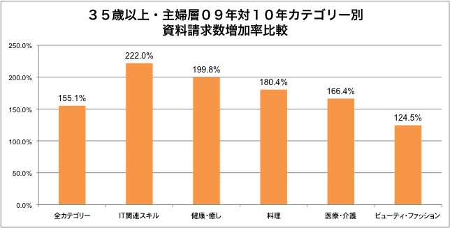 株式会社パセリでは2010年の人気資格動向調査(各年代、性別、職業別)を実施。その結果から、35歳以上の主婦の資料請求が前年比1.5倍以上増加、中でもIT関連のスキルが前年比2.2倍以上増加していることがわかった。