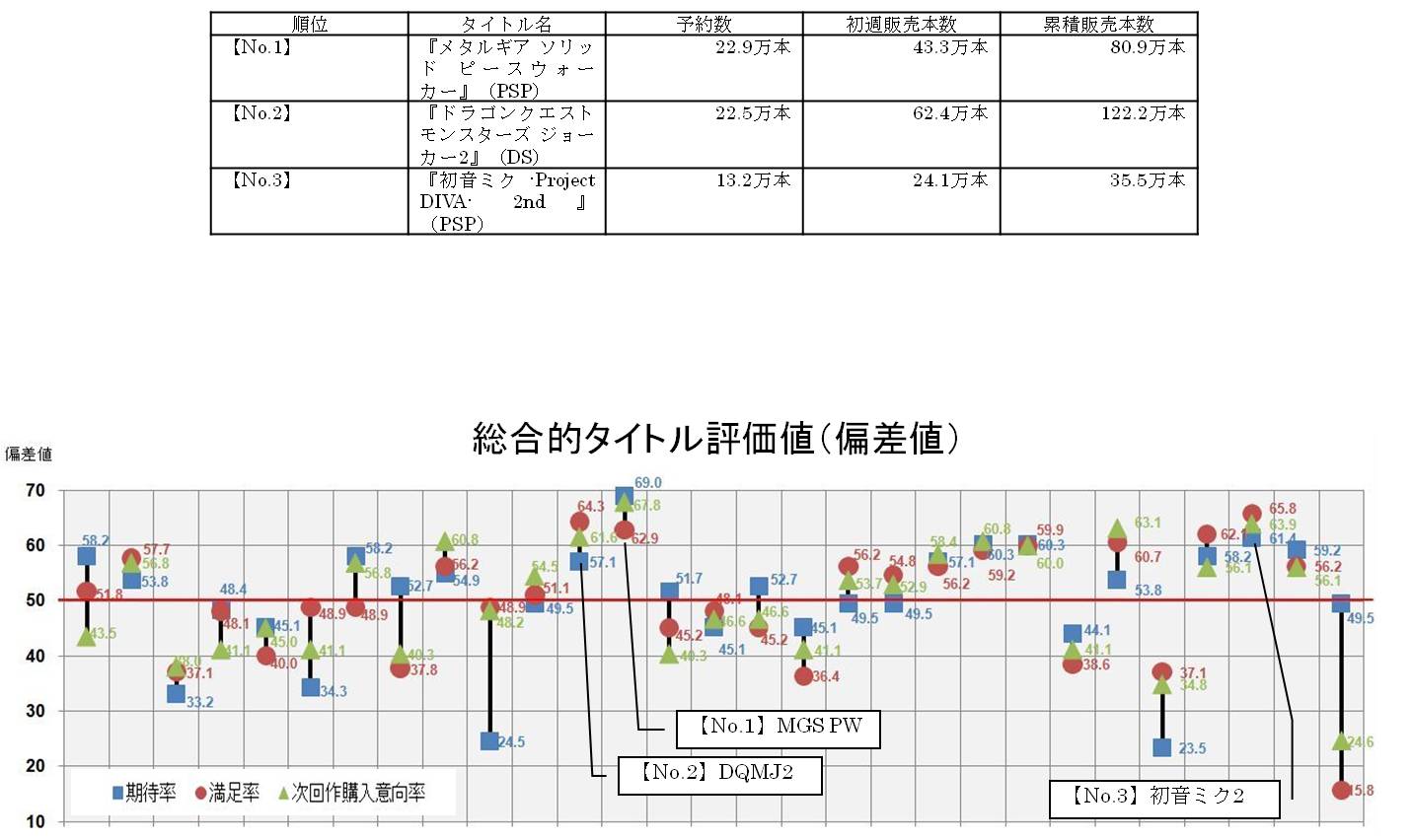 株式会社メディアクリエイトが1月に開始した満足度調査指標「タイトルカルテ」によると、2010年(11月末現在)における満足度評価No.1は『メタルギア ソリッド ピースウォーカー』(PSP)。2011年も継続して年間60タイトルを調査予定。