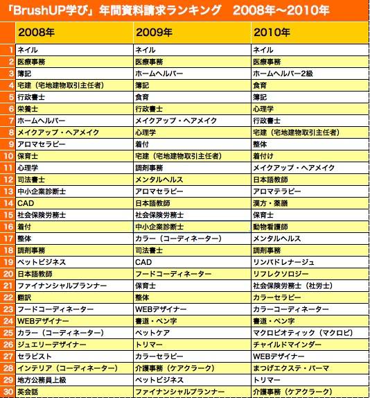 資格・スキル・通信教育情報総合サイト【BrushUP学び】「2010年人気資格 総合ランキング」を大発表!2008年、2009年、2010年の人気資格ベスト30を比較。リーマンショックの前後で、資格の動向に変化が。
