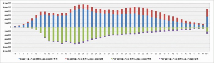 携帯ゲーム機のユーザー層はDSが20代前半、PSPが10代後半中心となる。2011年、3月末時点