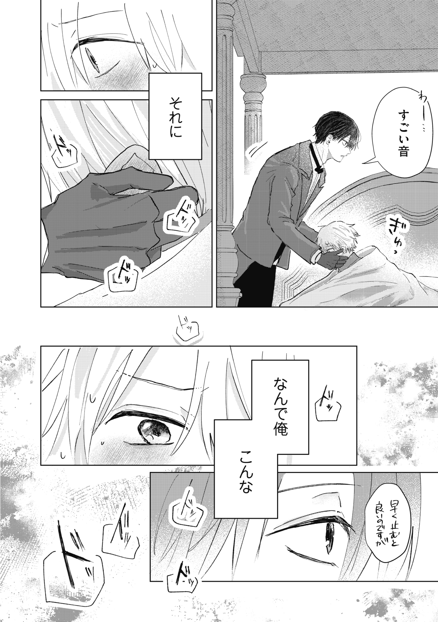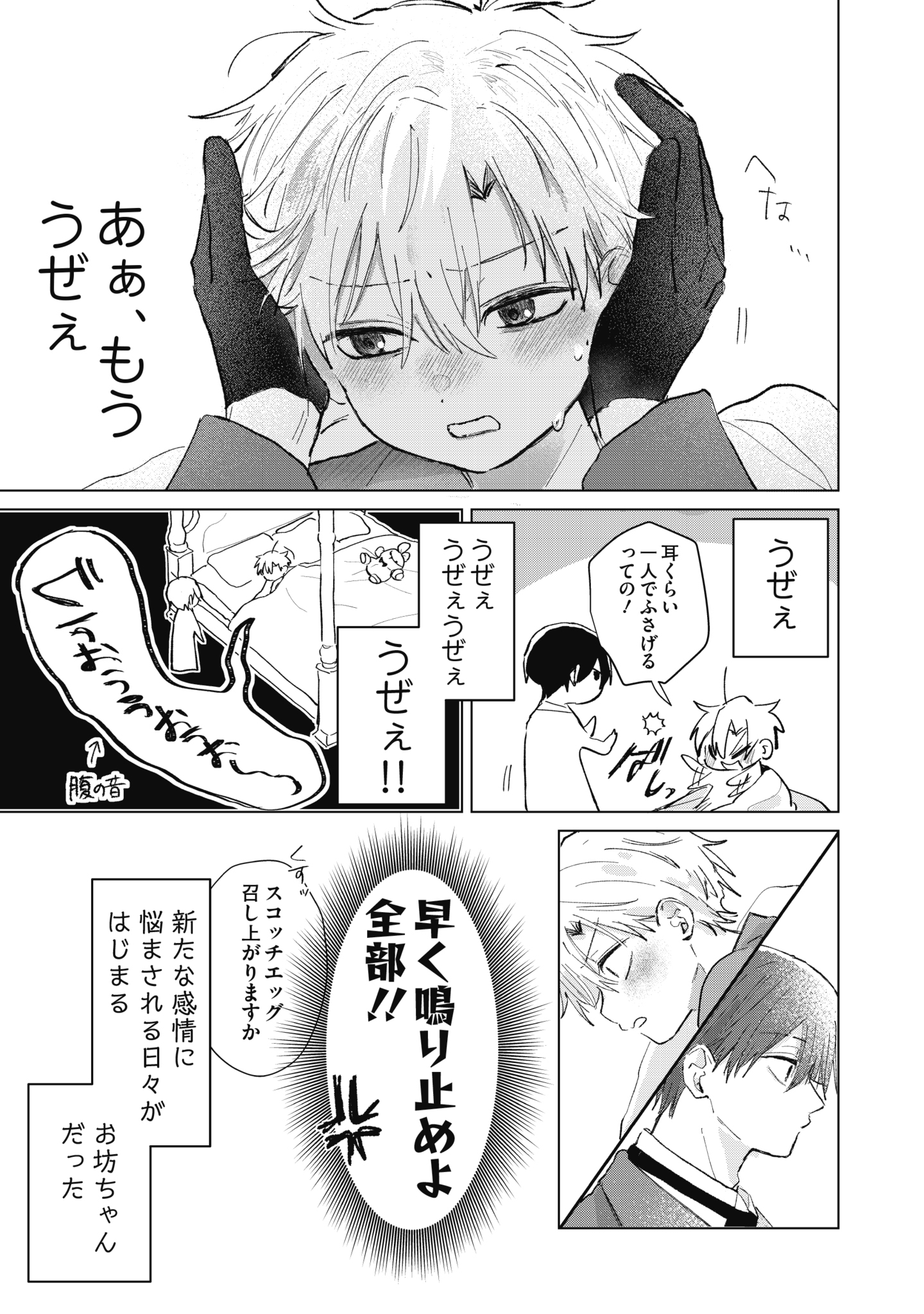 フィンとアルの関係性の変化が徐々に見えてくる第2巻。1巻時よりも1話ごとのお話が長めにもなり、より坊ちゃんの心情が丁寧に描かれていきます。フィンは頭の中で考えることがいっぱいで、おかしな言動をくりだしながらも、そのグルグルと悩む姿が愛おしいです…!! フィンお坊ちゃんをとりまく使用人や学友たちとの掛け合いも増え、坊ちゃん自身のキャラクターも色んな視点から楽しめます。思春期ならではのやきもきしながら感情を持て余す姿と、その様をあたたかく(!?)見守る周囲の人たちとのやりとりも必見!エピソードが進むに連れてキュン?ギュン?が加速していく本作、どうぞお楽しみください。
