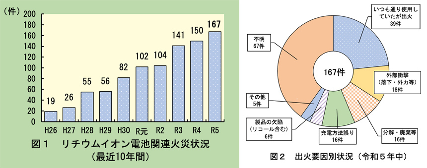 リチウムイオン電池を搭載した製品から出火する火災が多く発生しています。出火要因をみると、使用者の明らかな誤使用(分解、衝撃、充電方法誤り等)により出火する火災の他に、製品の欠陥により製品から突然出火する火災も発生しています。