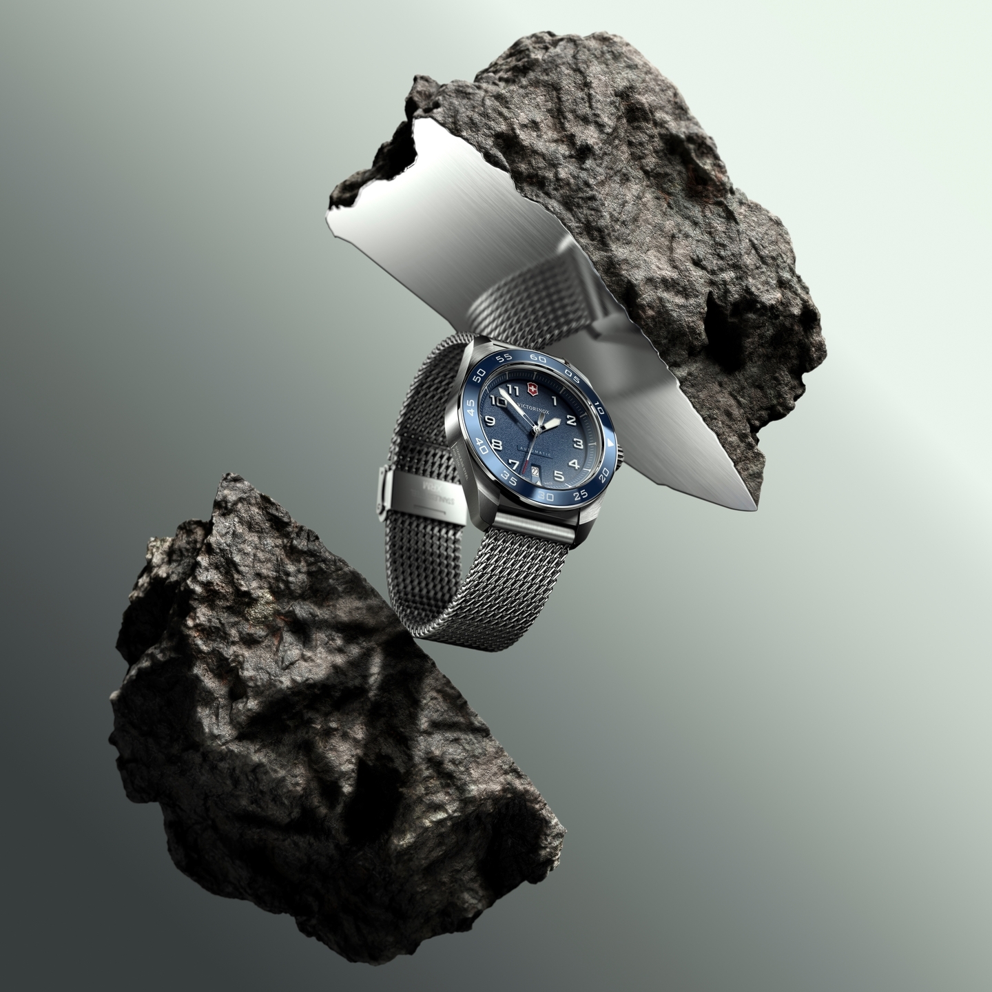 最大3つのタイムゾーン表示が可能なGMTモデル。移動の多いビジネスパーソンにおすすめ。2025年10月31日発売予定。試着は全対象店舗で可能ですが、販売はビクトリノックス 銀座店、グランフロント大阪店、横浜ランドマークプラザ店、ONE 福岡店の4店舗限定となります。