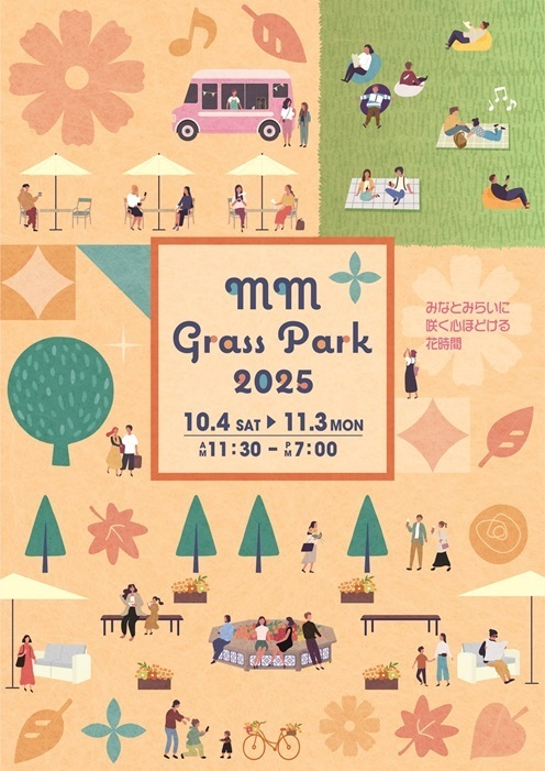 2025年10月4日(土)〜11月3日(月・祝)、グランモール公園の「美術の広場」で、くつろぎの空間 と合わせ様々なイベントをお楽しみいただける『MM Grass Park 2025』を開催します。