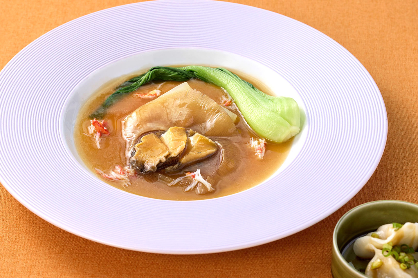 10月は、素材を活かした調理法が特徴の広東料理の王道メニュー「フカヒレの姿煮 あわびを添えて」。高級食材の代表格・フカヒレとあわびを、醤油ベースの味わい深いタレでじっくりと煮込みました。