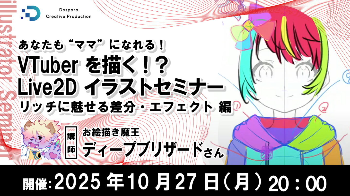 ドスパラは、お絵描き魔王ことディープブリザード氏を講師に迎え、『VTuberを描く!?Live2Dイラストセミナー 第4弾 リッチに魅せる差分(パターンやバリエーション)・エフェクト(効果)編』 を2025年10月27日(月)20時よりオンラインで開催します。現在、参加者を募集しています。