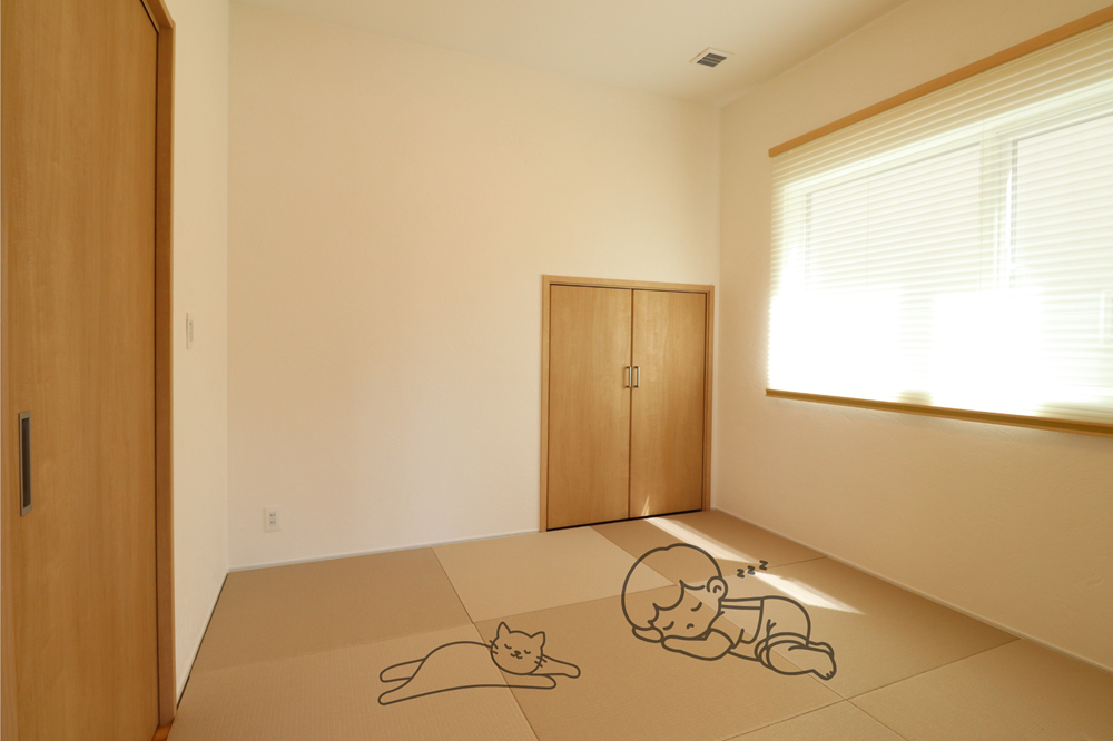 リビングにはソファーを置かず、思いっきり走り回れる広々空間に。キッチンのすぐ横には約2.5帖の畳スペースを設け、料理の合間にちょっと横になったり、お子さんのお昼寝や遊び場として活用できます。