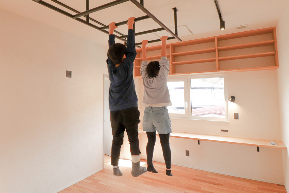 2階ホールには雲梯(うんてい)を設置し、賃貸住宅では叶えられない「思いっきり遊べる暮らし」を実現しています。