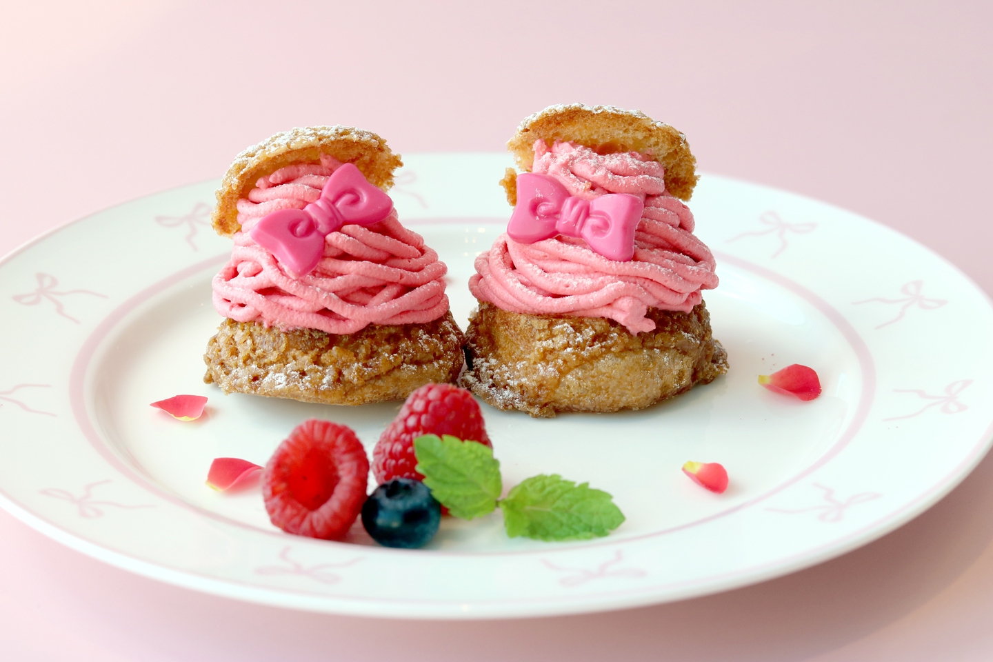 苺のペーストを使用した爽やかな酸味と甘みがマッチした可愛らしいピンクリボンモチーフのモンブランシュークリームです。
