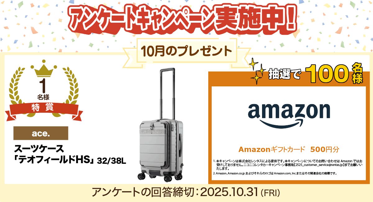 「ニコニコレンタカー」では、レンタカーご利用後に配信されるアンケートにご回答いただいた方の中から、毎月抽選で豪華賞品が当たる「アンケートキャンペーン」を開催しています。10月の商品はace.のスーツケース「テオフィールドHS」 32/38Lです。また、Amazonギフトカード500円分も抽選で100名様に当たります。ぜひこの機会に「ニコニコレンタカー」に対する率直なご意見をお聞かせください。