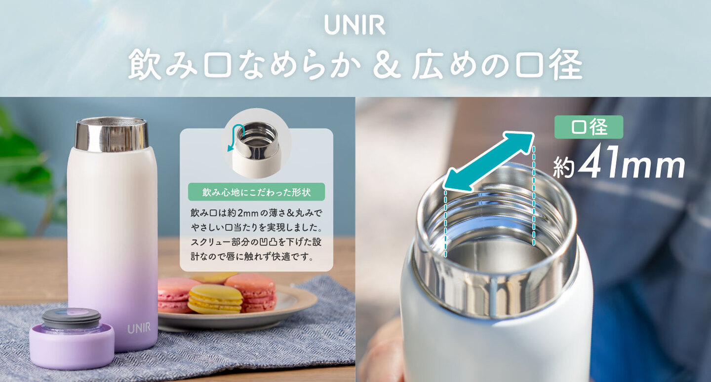 飲み心地にこだわり飲み口は約2mmの薄さと丸みを帯びた形状に。さらにスクリュー部分(ねじ部分)の凹凸は唇が直接触れないよう通常よりも下げた位置にすることで口当たりを向上させています。また、口径は約41mmと広めに設計されており、スポンジブラシを使って洗いやすいだけでなく氷も簡単に入れられます。