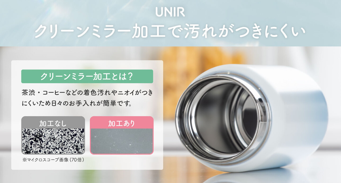 内びんにはクリーンミラー加工を施すことで表面がなめらかで汚れやニオイが付着しにくいため、日々のお手入れがとても簡単です。コーヒーや紅茶などを水筒に入れた際のニオイや着色汚れを、最小限に抑え清潔にお使いいただけます。また、スポーツドリンクにも対応しているのでスポーツやフィットネス、レジャーなどのアクティブシーンでの使用にもおすすめです。