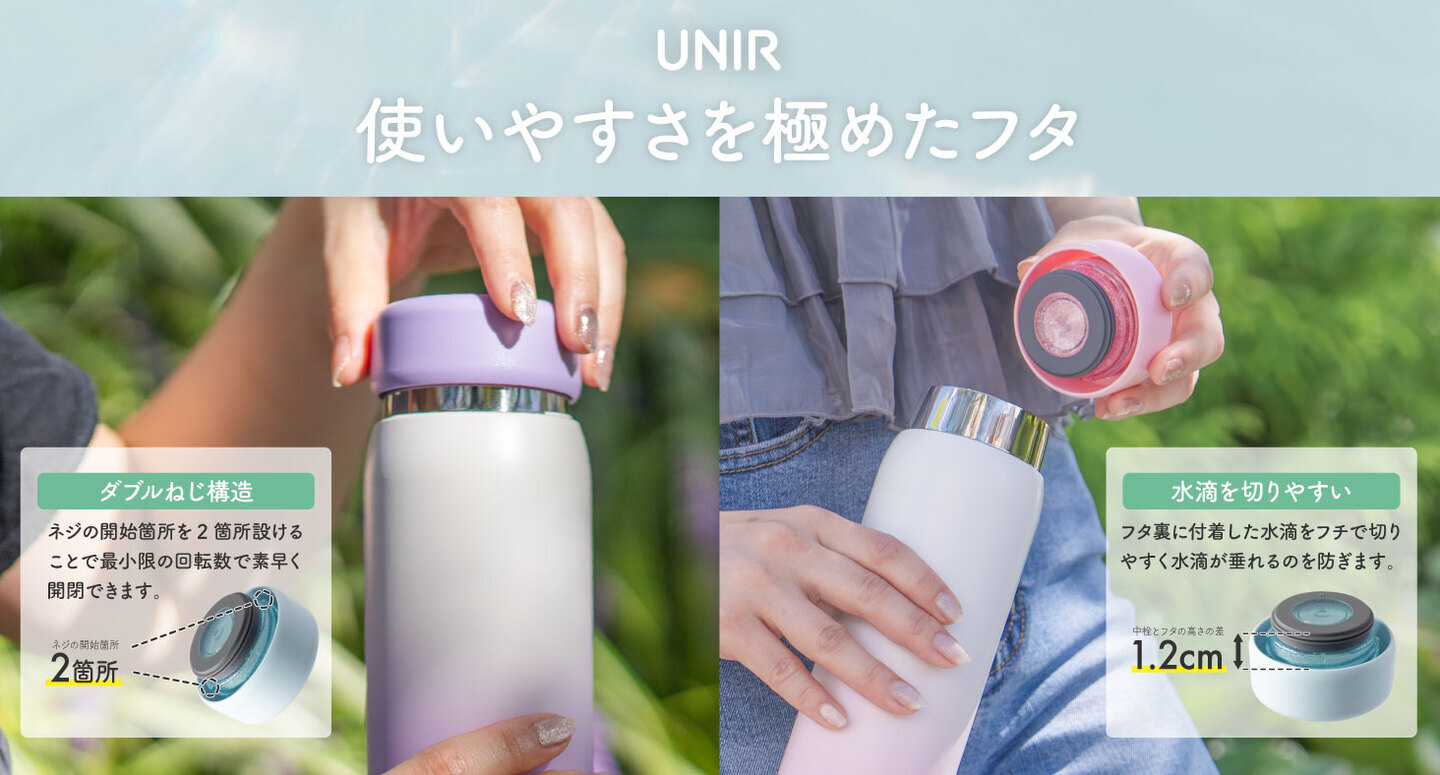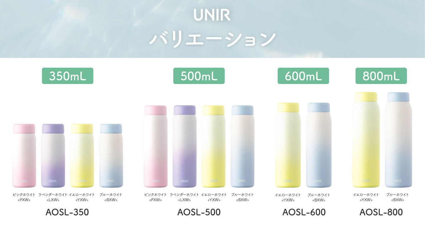 ステンレス製卓上用品・キッチン用品の企画・製造・販売を行う株式会社アトラス(本社:東京都八王子市 代表取締役:林一郎)は、2025年10月7日(火)より『UNIR(ユニール) シームレスボトル』を発売します。本製品はコロンとした丸いフォルムと優しい色合いが溶け合うグラデーションカラーを採用。ファッション感覚で持ち歩きたくなる「ときめくデザイン」に仕上げました。様々なスタイルに馴染みやすく、リンクコーデや大切な方への贈り物としてもおすすめ。また、デザイン性だけでなく機能性を追求したフタとパッキン一体型のシームレス構造で洗い物の手間を大幅に軽減できるほか、パッキンのつけ忘れや紛失などのトラブルを解消します。さらに、ダブルねじ構造により少ない回転数で開閉できるフタや優れた保温・保冷性能を発揮する真空断熱二重構造、汚れやニオイを防ぐクリーンミラー加工を採用し使いやすさと機能性の両立を実現しました。