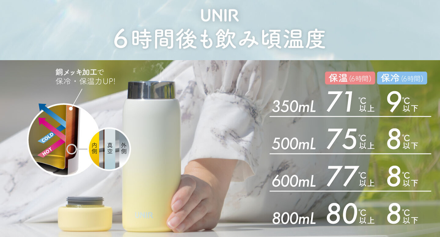 真空断熱二重構造に加え真空層に銅メッキ加工を施し、断熱材入りのフタを採用することで長時間の優れた保冷・保温性能を実現しました。例えば800mLサイズでは、保温は6時間後も80℃以上、保冷は6時間後も8℃以下とヒンヤリ温度が長持ちするため一年を通して活躍します。