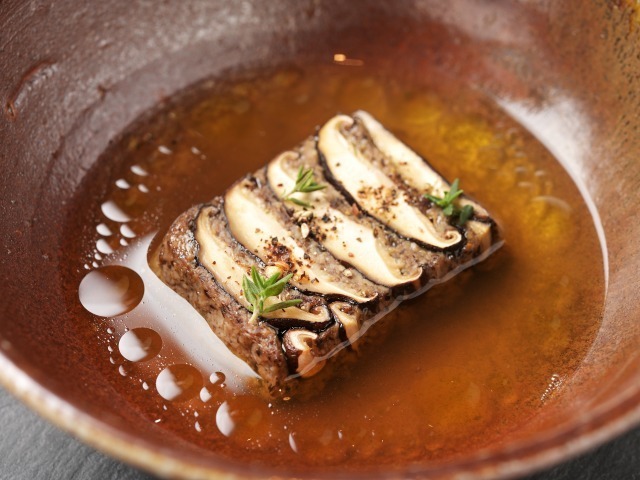 きのこの産地として知られる長野県。その豊かな山の幸が育むテロワールを映し出す一皿が、田邉シェフのスペシャリテ「椎茸のテリーヌ」です。通常は長野県産の椎茸を用いていますが、今回は杭州の椎茸で新たに再構築。ゼラチンを一切使わず、椎茸本来の粘着性を生かして仕上げ、魚のコンソメと重ね合わせることで、滋味深く奥行きある味わいを生み出します。