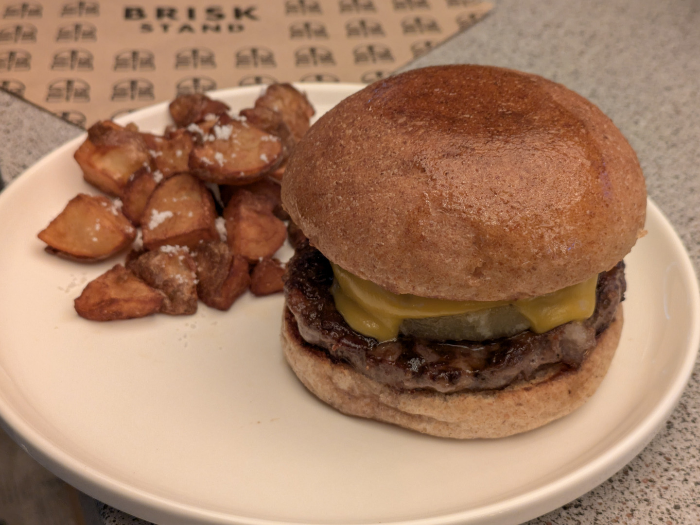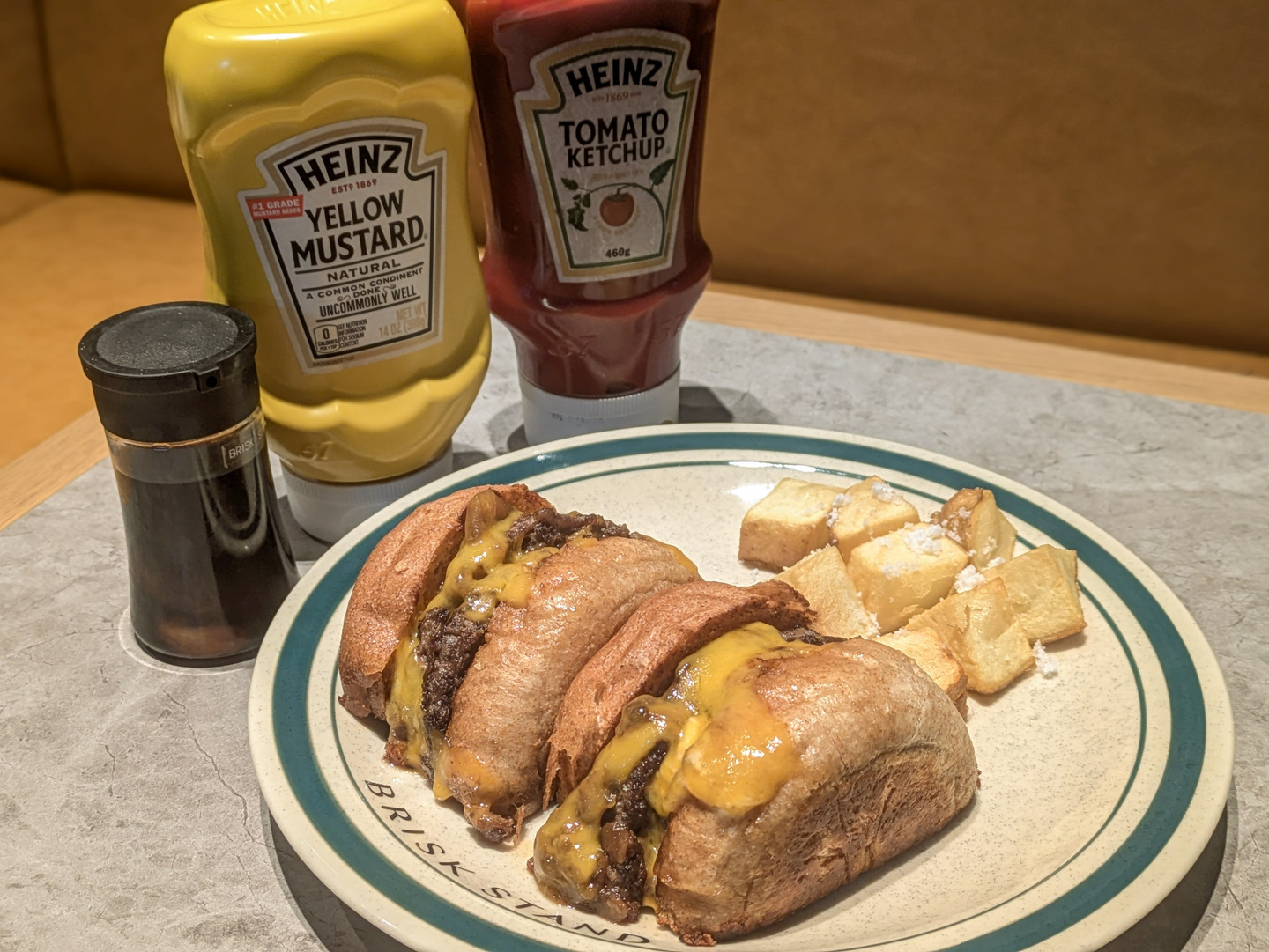 『BRISKSTAND』の名物「切ったやつ」は、鉄板でパティを焼く際に流れ出る肉汁を「一滴たりとも無駄にしたくない」というユニークな発想から生まれました。ハンバーガーを半分にカットし、その断面を鉄板で焼き付けることで、バンズに肉汁と旨味を余すことなく吸わせています。