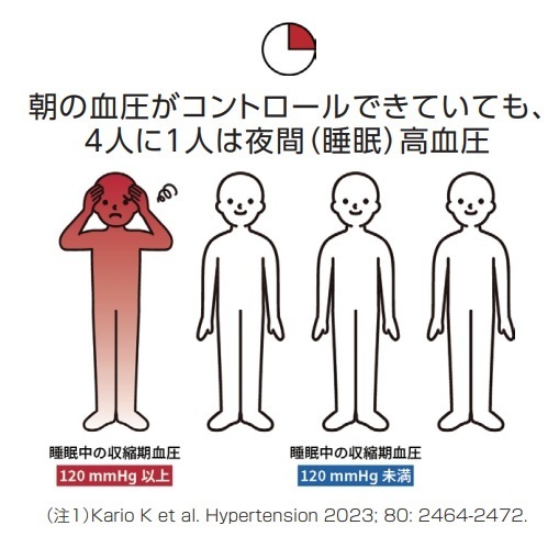 自治医科大学 内科学講座 循環器内科学部門の苅尾七臣教授は、朝の血圧がコントロールできていても4人に1人は夜間(睡眠)高血圧で(注1)、睡眠中の高血圧は脳卒中の発症リスクが高くなる(注2)との研究結果を発表されています。