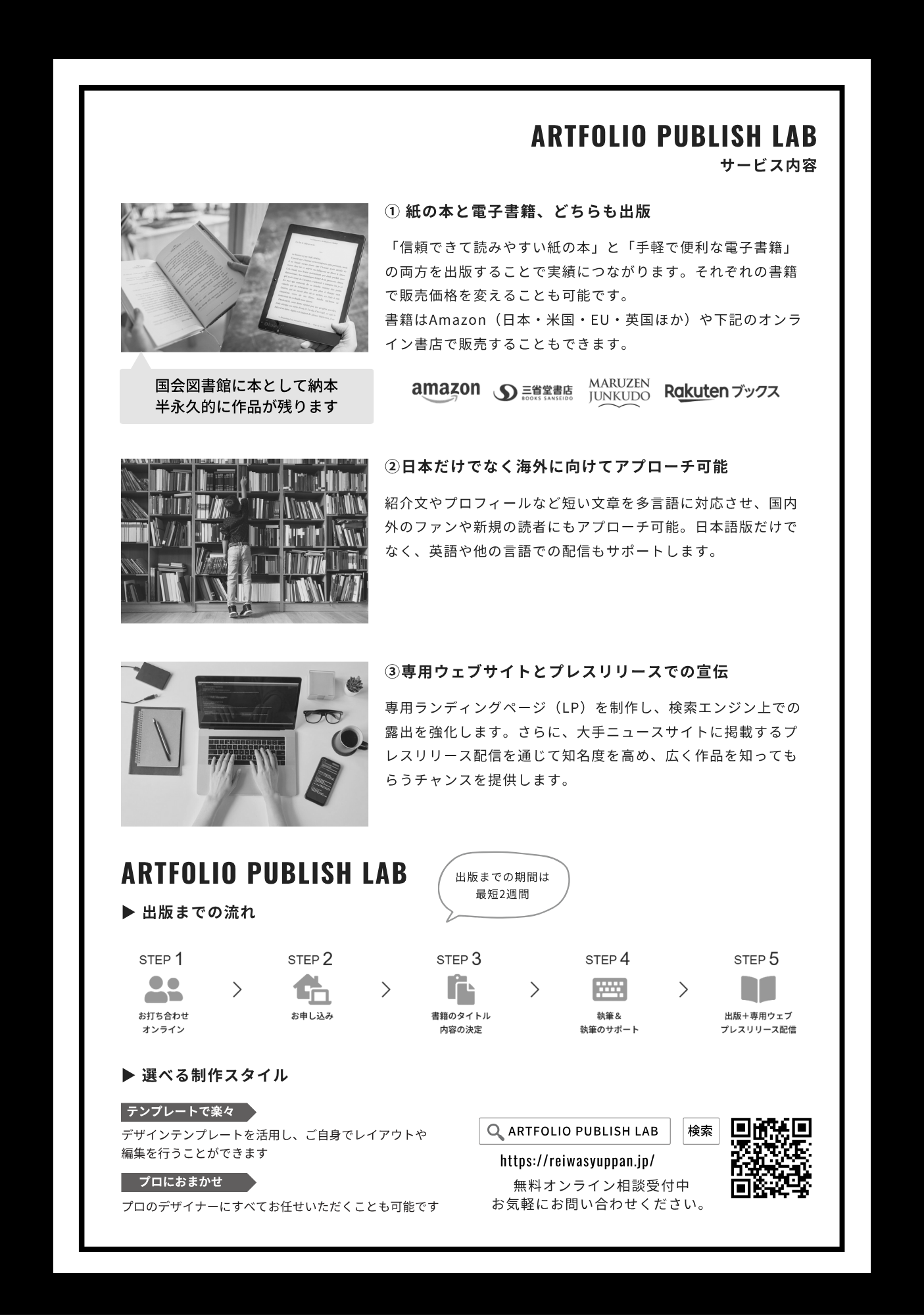 令和出版は、アーティストの皆様の作品を日本国内だけでなく世界中に届ける、作品集・写真集・絵本出版支援サービス「アートフォリオ・ラボ」の提供を開始しました。本サービスは、初期費用を抑えたPOD(プリント・オン・デマンド)出版を採用し、日本を含めた世界で紙の本と電子書籍両方での出版を実現します。