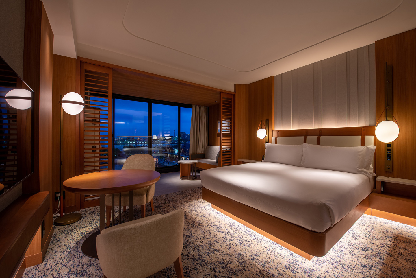 客船を想起させる上質でスタイリッシュなインテリアの客室からは、クリスマスのイルミネーションが輝くみなとみらいの街並みや、横浜の海や港、緑豊かな中庭などが一望できます。