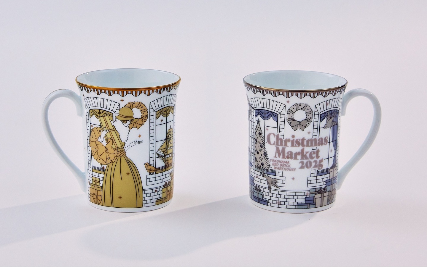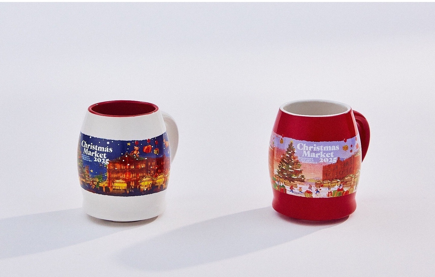 “みなとみらいの夜景を背にした横浜赤レンガ倉庫に雪とプレゼントが降りしきる12月24日の夜”を描いた白、“みなとみらいの港を背にした朝焼けの横浜赤レンガ倉庫に雪とプレゼントが降り積もる12月25日の朝”を描いた赤、の2色展開です。