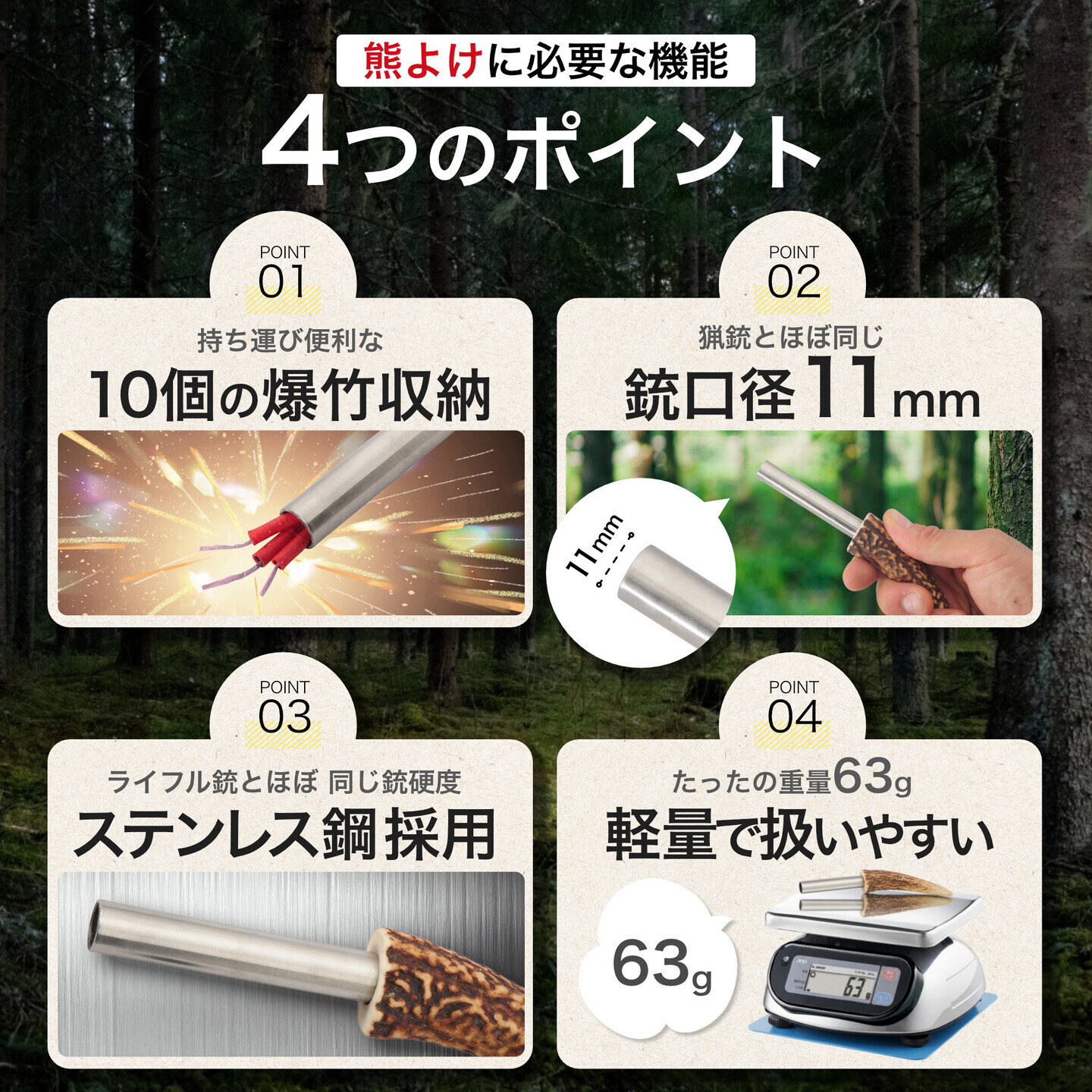 もしもの熊よけにお使いいただける「熊おどし」は、同じモノが二つとない美しい鹿の角の模様と手のひらサイズのグリップで、見ても触っても楽しい、美と機能を備えたデザインです。銃砲身は猟銃で使用される硬度のステンレス鋼を採用し、内径11mmのこちらも同等の仕様サイズになっています。猟銃の仕様に合わせた銃身のため爆竹の音が増幅され、大音量の熊よけグッズです。さらに専用のゴム栓の装着で爆竹10個まで収納する事が出来て、持ち運びに便利な爆竹収納になっています。ゴム栓は紛失の心配いらずな2個を同封しています。