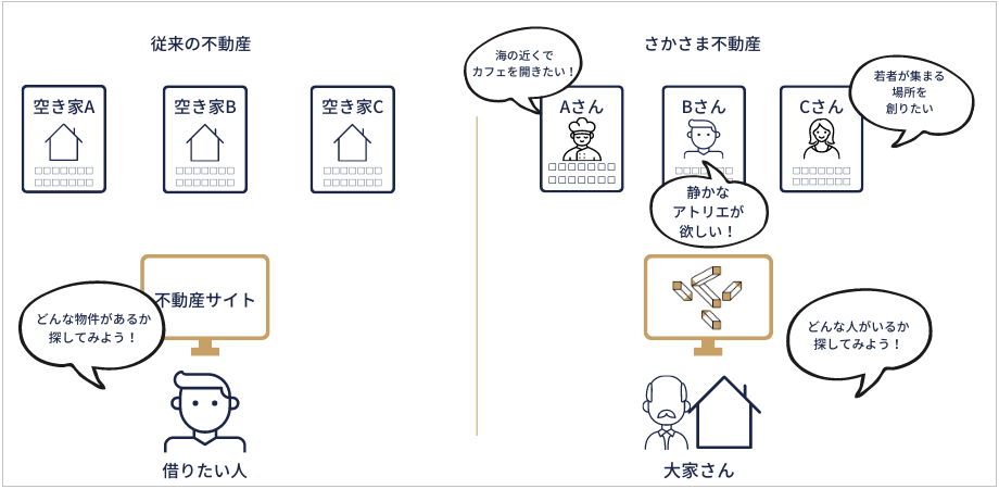 空き家を借りたい人の想いを公開し、共感した大家や地域が借り手を選ぶ仕組み。「誰にでも貸したいわけではない」という心情を持つ所有者の潜在物件を掘り起こし、借り手とつなぐことで、空き家は本屋や飲食店、ゲストハウスなど、創業や移住、関係人口創出の拠点へと再生してきました。