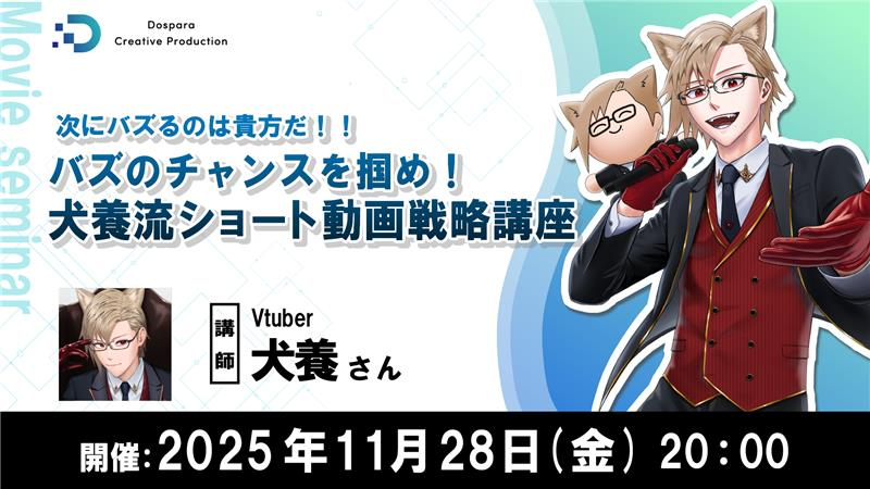 ドスパラは、人気Vtuber犬養氏を講師に迎え、『バズのチャンスを掴め!犬養流ショート動画戦略講座』を2025年11月28日(金)20時よりオンラインで開催します。現在、参加者を募集しています。