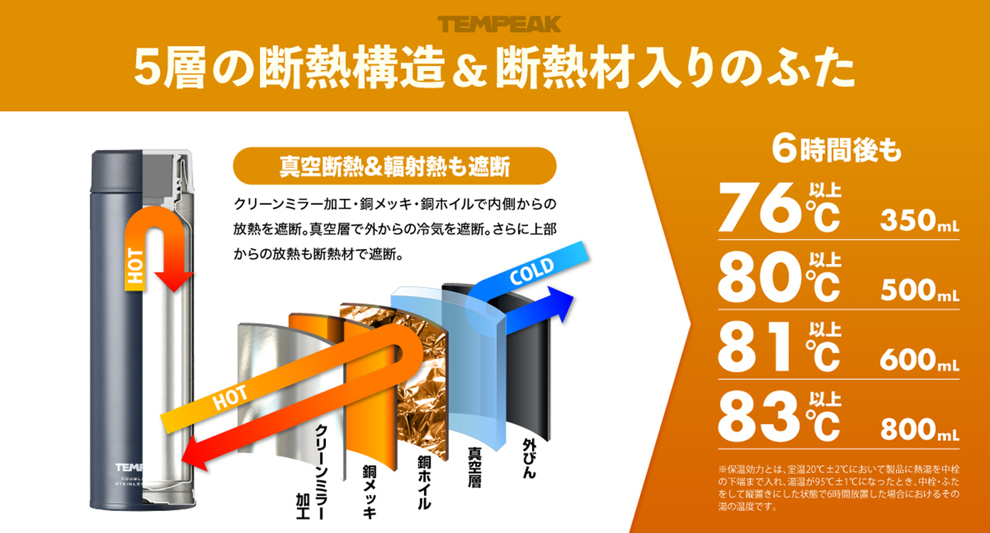 保温効力※(6時間後) : 76°C以上(350mL) / 80°C以上(500mL) / 81℃以上(600mL) / 83度以上(800mL)