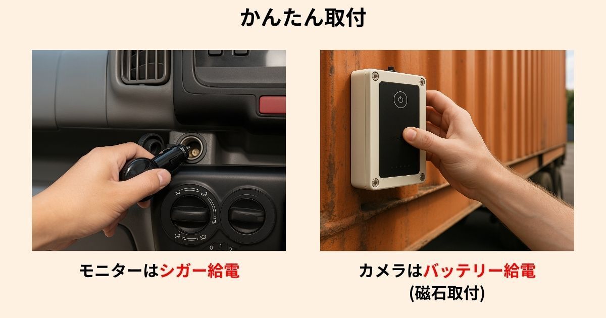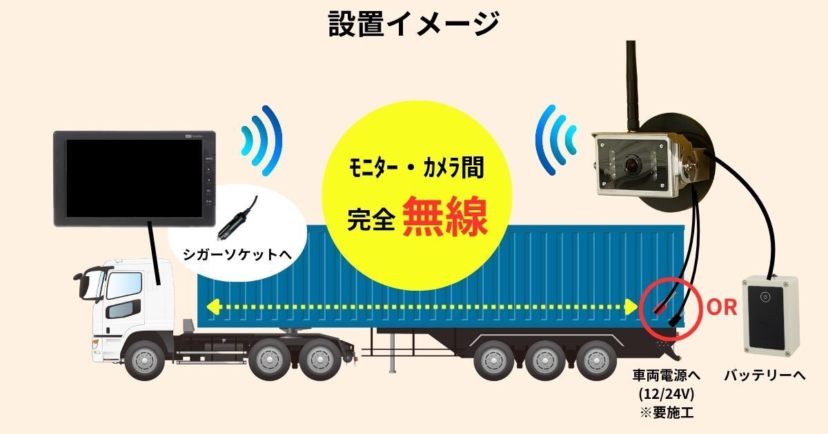 安全対策の必要性は高まる一方で、従来のバックカメラ・サイドカメラは有線配線・電源工事が必須であり、切離し車両では実装が困難でした。