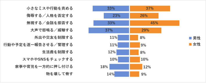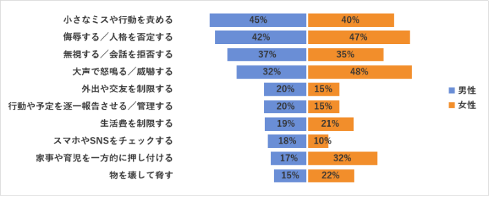 「無視する・会話を拒否する」は女性45%に対し男性33%、「侮辱する・人格を否定する」も女性26%、男性23%と、いずれも女性が上回りました。