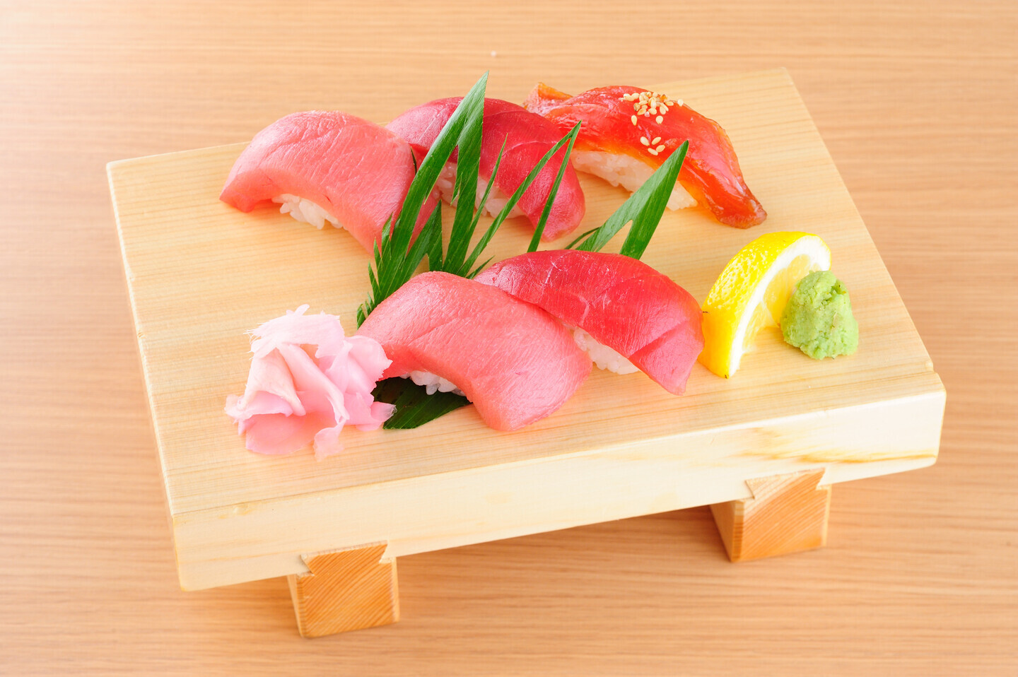 “熟成寿司”は、鮮魚を最適な温度・湿度で数日から20日程度寝かせることで、旨味をを引き出した一品。一般的なとれたての新鮮さと異なり、魚の持つ脂と旨味が調和した深みのあるコクが特徴です。特に「熟成生本まぐろ」「熟成たい」「熟成かんぱち」などが多く注文されるメニューで、ねっとりとした舌ざわりと香りが口いっぱいに広がります。