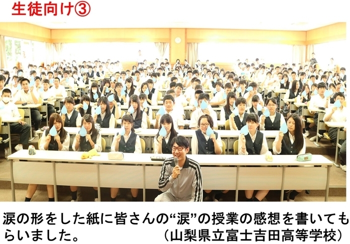 「涙活は、ストレス解消を図る方法として考案されましたが、それを教育にも応用したのが、「涙活」を使った授業です。人は涙を流すとき、おでこの先にある前頭前野、通称、共感脳を震わせます。人は何かに感動した時や共感した時に、共感脳が震え、涙活は、この共感脳を震わせる活動でもあります。その仕組みを利用し、共感力や自己肯定力を高めるワークショップを開発し、小中学校、高校で、実践しています。また「総合的な学習の時間」や「探求学習」、「ロングホームルーム」、「道徳」「保健」の授業でも題材として提供しています。