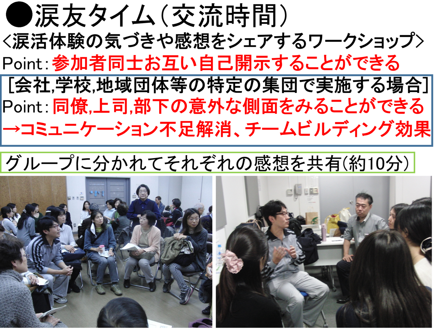 涙活体験の気づきや感想、「どこで涙が出たのか、なぜ涙が出たのか」の話を参加者同士でシェアします。
