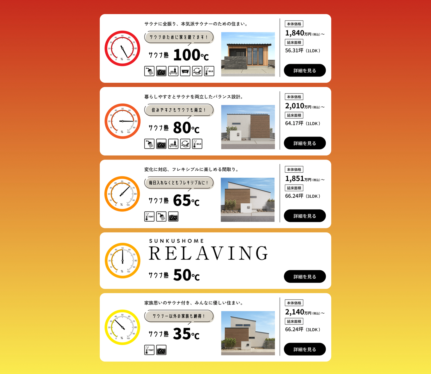 株式会社サンクスホーム(本社:三重県津市、代表取締役社長:堂 貴也)は、2025年10月24日(金)、自宅でサウナと暮らすライフスタイルを提案する住宅ブランド「SAUNiE(サウニー)」を発表しました。「お気に入りのサウナを、もっと身近に、もっと手軽に。」という想いのもと、サウナーの情熱と住宅設計の知見を融合。コスト・スペース・デザインを最適化し、予算や暮らし方に合わせて選べる4つのサウナ住宅プランを展開します。また、SAUNiEの発表とあわせて、「毎日をリゾートのように楽しむ」をテーマにした新住宅ブランド「RELAVING(リラビング)」も同時に発表します。サンクスホームは、2つのコンセプトブランドを通じて、暮らしに「リラクゼーション」と「ととのい」を届ける新たな住まい提案します。