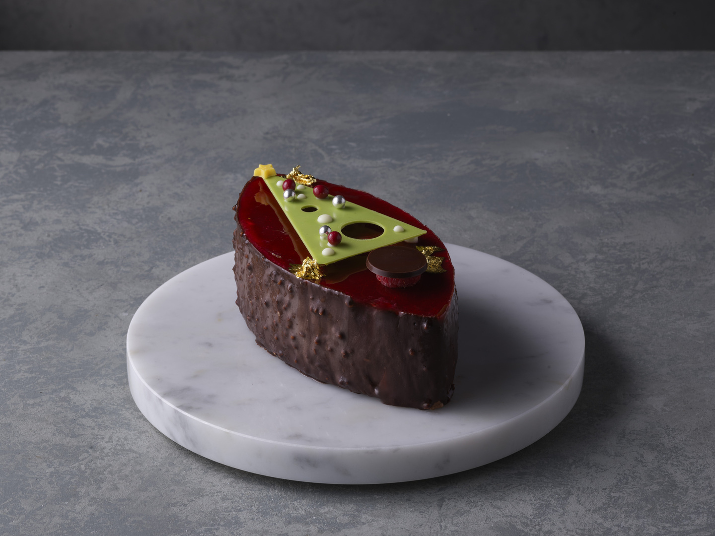 ショコラとクリスマスツリーをモチーフにバニラムース、グリオットコンポート、グリオットジュレ、リンツショコラのムース。ひと際目を引くクリスマスツリーのモチーフが一気にホリデームードを演出します。