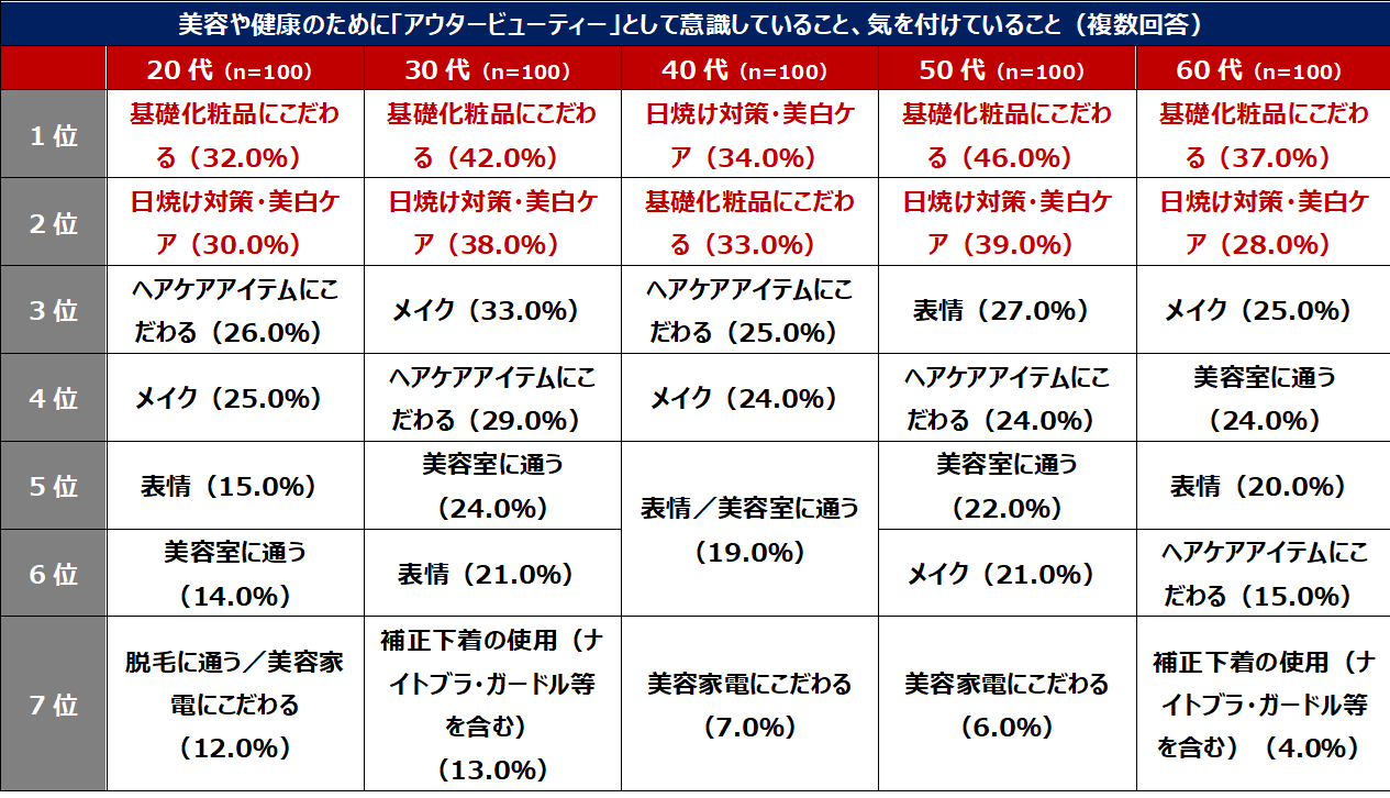 2.アウタービューティーは世代問わず「基礎化粧品にこだわる」「日焼け対策・美白ケア」が上位に