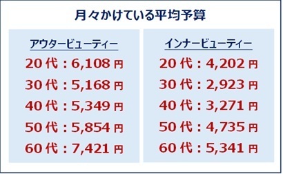 アウタービューティーとインナービューティーそれぞれに月々かけている金額を聞いたところ、平均金額はどの年齢層でも1,000円〜2,200円ほどアウタービューティーの方が高い結果となりました。インナービューティーは、栄養バランスや生活習慣など、お金をかけずに意識できることも多い中でも、各世代一定の金額を使っているようです。また、若い世代である20代が、50代・60代に次ぐ平均金額となり、メイクやスキンケアといったアウタービューティーだけでなく、内側から美しくなるインナービューティーにも注目し、ある程度お金をかけていることが分かります。