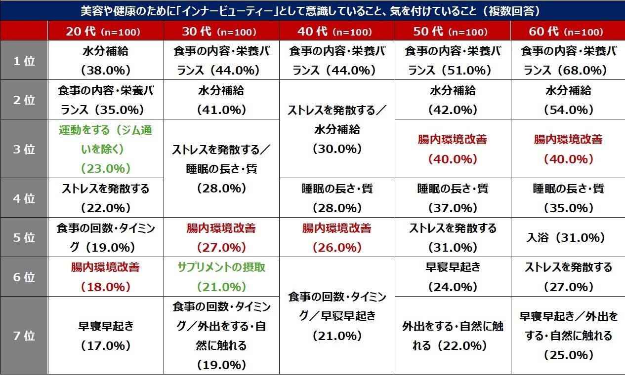 実践している人がより多かったインナービューティー。20代においての1位は「水分補給(38.0%)」、60代においての1位は「食事の内容・栄養バランス(68.0%)」でした。20代では「運動をする(ジム通いを除く)(23.0%)」、30代では「サプリメントの摂取(21.0%)」が他の世代と比べて上位にランクイン。「腸内環境改善」は、年齢層が上がるほどランキングも上がるという傾向が見えました。