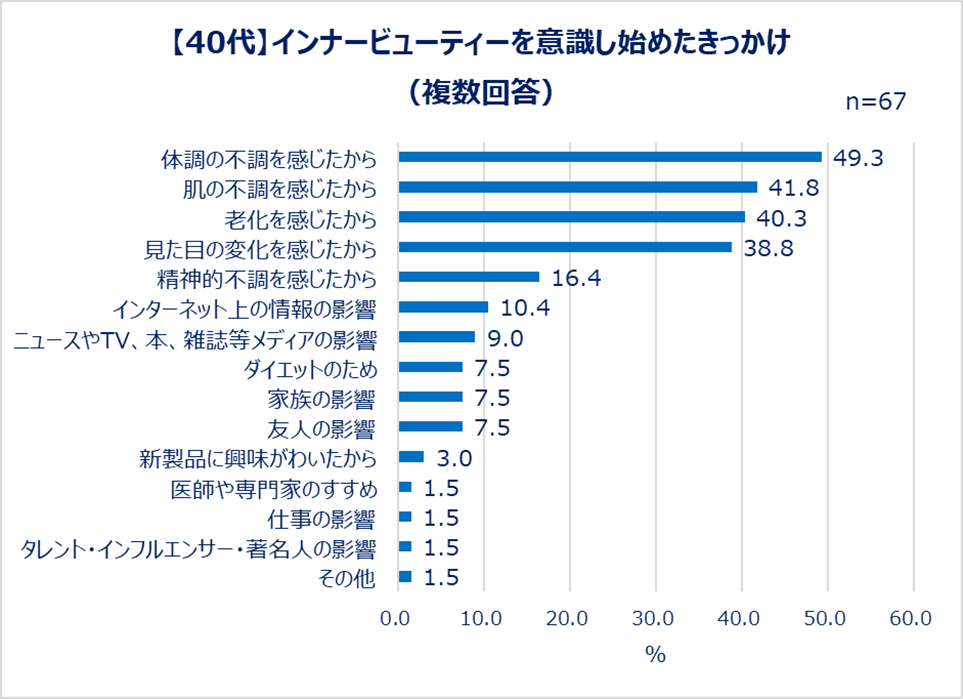 30代、40代においても、上位は自身の肌や見た目、体調についての変化を感じたことでした。「ダイエットのため(20代:18.8%/30代:15.1%/40代:7.5%)」や「タレント・インフルエンサー・著名人の影響(20代:8.7%/30代:8.2%/40代:1.5%)」と回答した人の割合に違いが見られました。