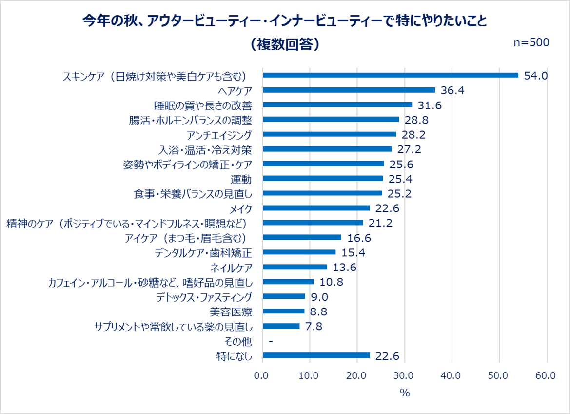 最後に、今年の秋、アウタービューティー・インナービューティーで特にやりたいことを聞きました。1位は「スキンケア(日焼け対策や美白ケアも含む)(54.0%)」、2位は「ヘアケア(36.4%)」、3位は「睡眠の質や長さの改善(31.6%)」でした。アウタービューティー領域にも、インナービューティー領域にも票が入り、内側からも外側からも美しくなりたい女性たちの心情がうかがえる調査結果となりました。
