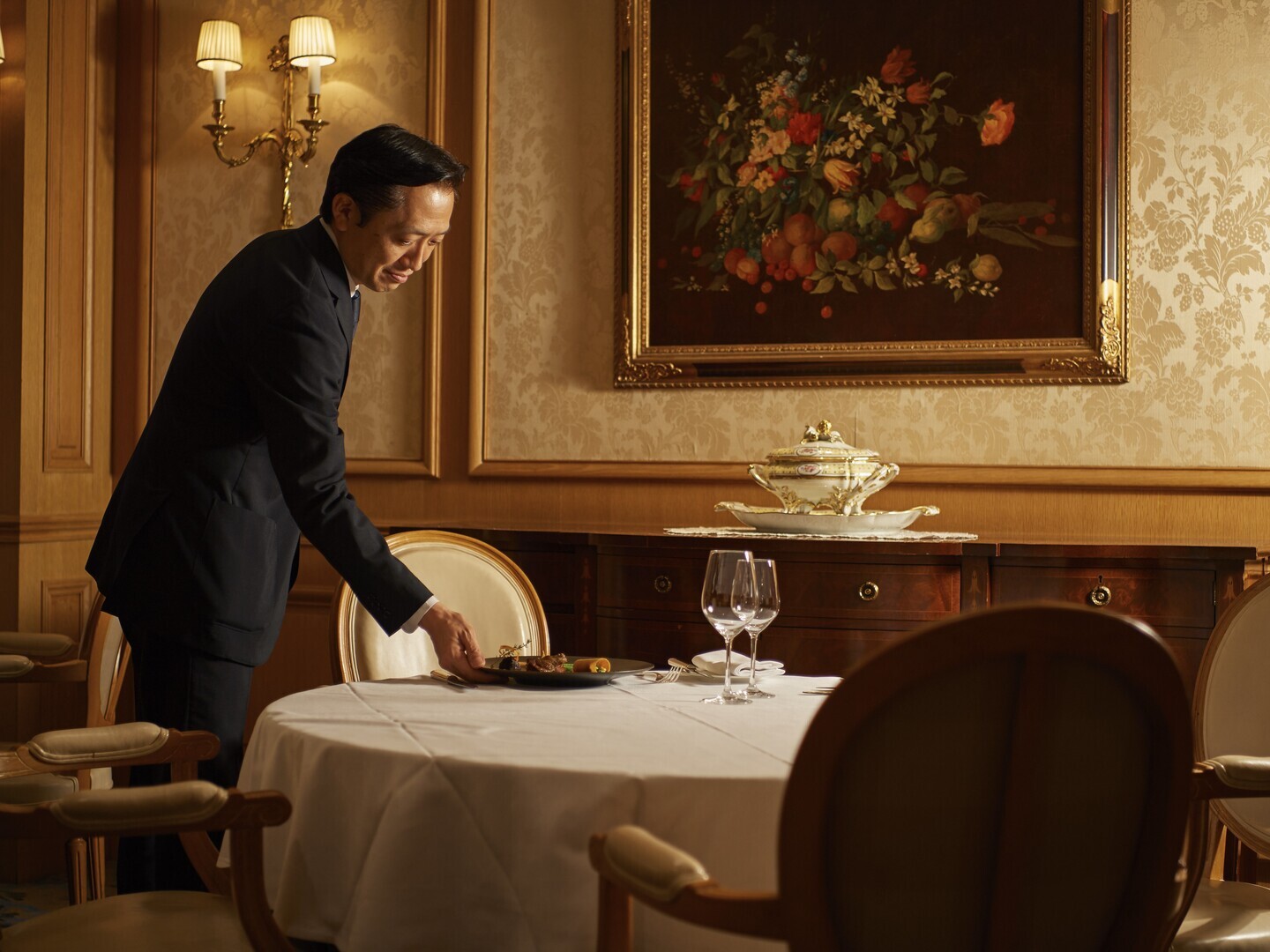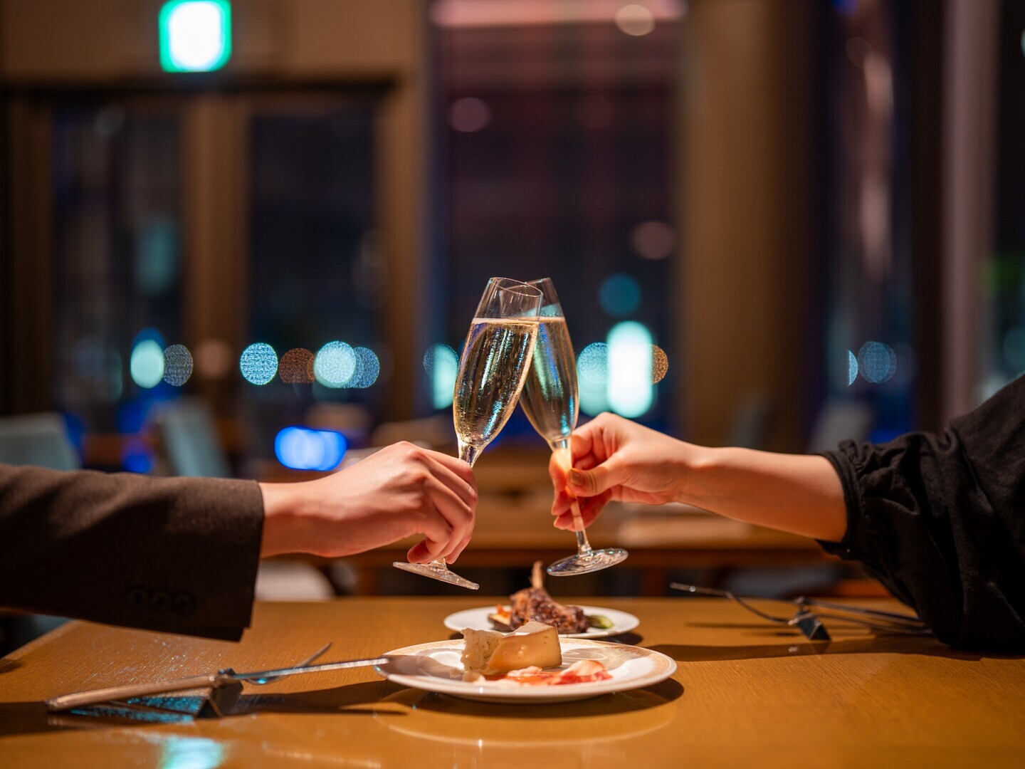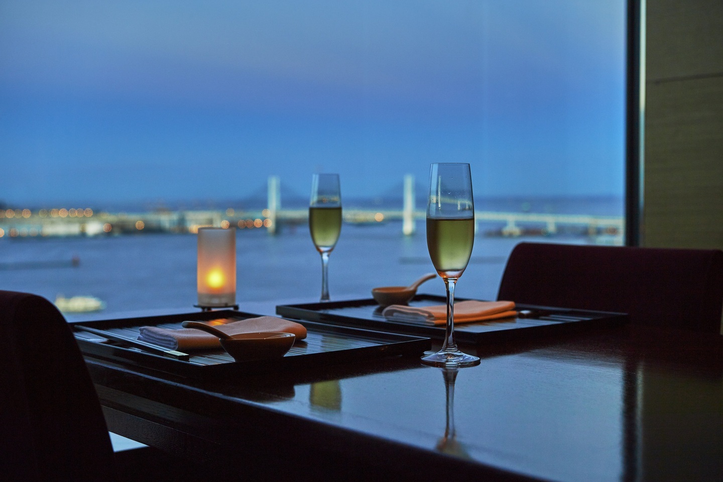 海上ならではの波のリズムを感じながら、パンチェッタを巻いたアンコウのローストや、黒毛和牛のパイ包み焼きなど、ホテル自慢の料理の数々を楽しめます。店内に流れる音楽と窓から見えるイルミネーションが、おふたりの時間をより一層ロマンティックに演出します。