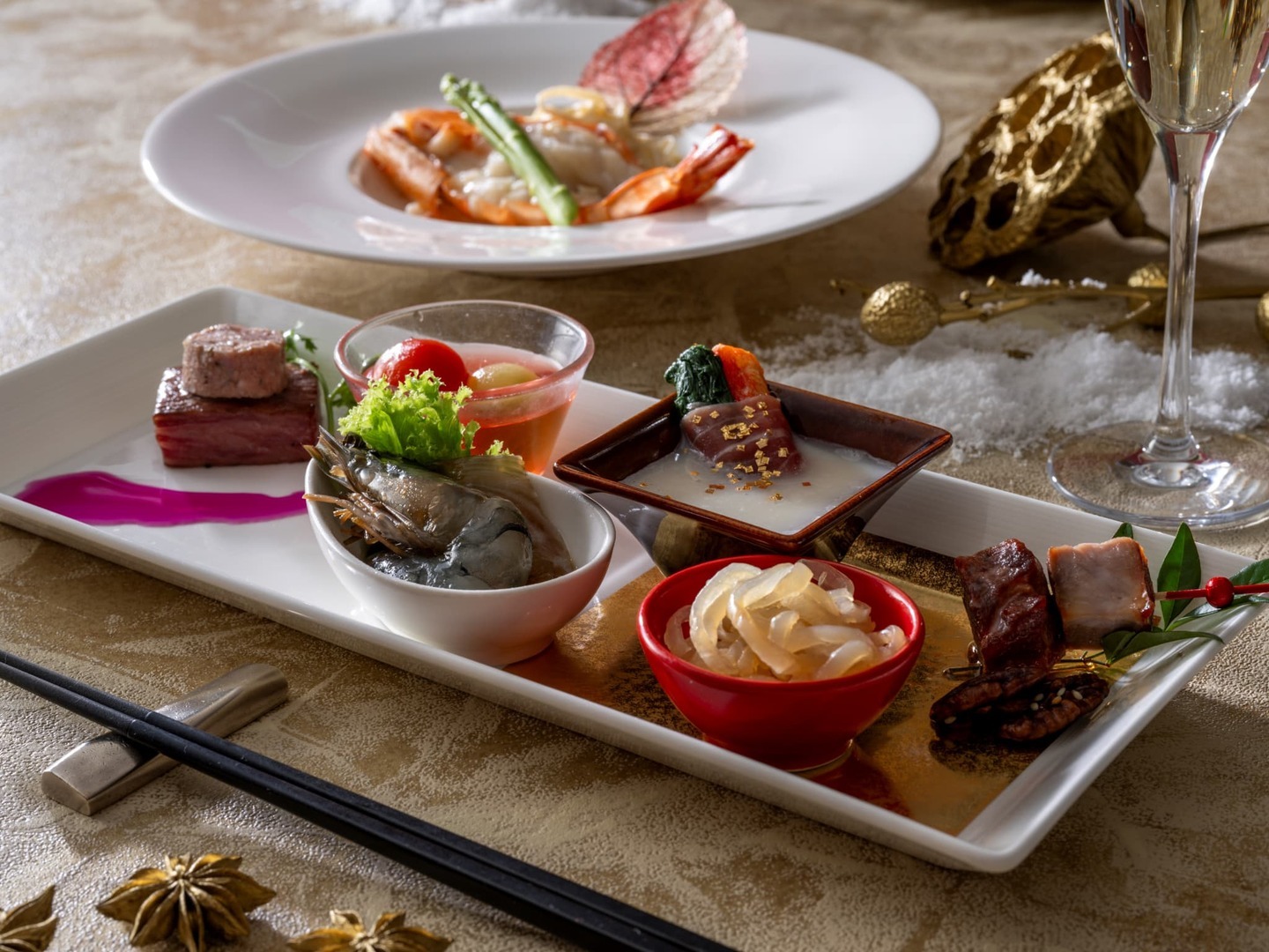 ホテル最上階31階のメインダイニング 中国料理「」では、色とりどりの前菜盛り合わせやフカヒレが丸ごと入った蒸しスープ、山形牛サーロインと高級魚ハタを組み合わせたメインディッシュなどの全6品に、グラスシャンパンとオリジナルの中国茶が付いた豪華絢爛なクリスマスディナーコースを愉しむことができます。