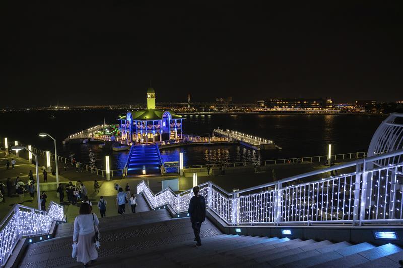 海上に浮かぶウッドデッキの先では、ぷかりさん橋が幻想的な光に包まれます。