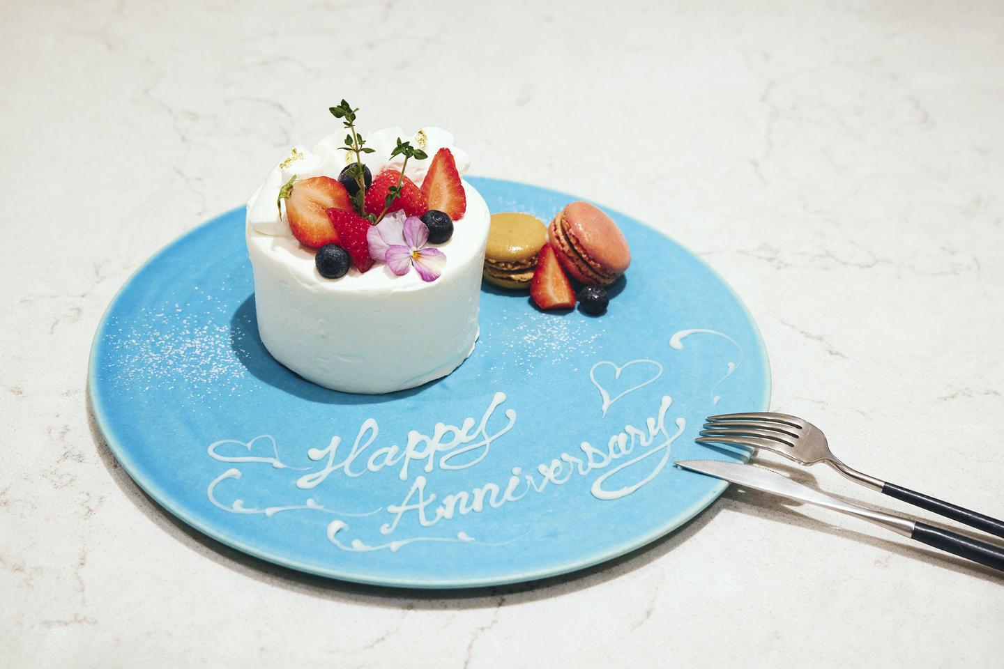 乾杯用のシャンパン付きで、事前メッセージを添えた記念プレートなど、心に残るディナータイムを過ごせます。