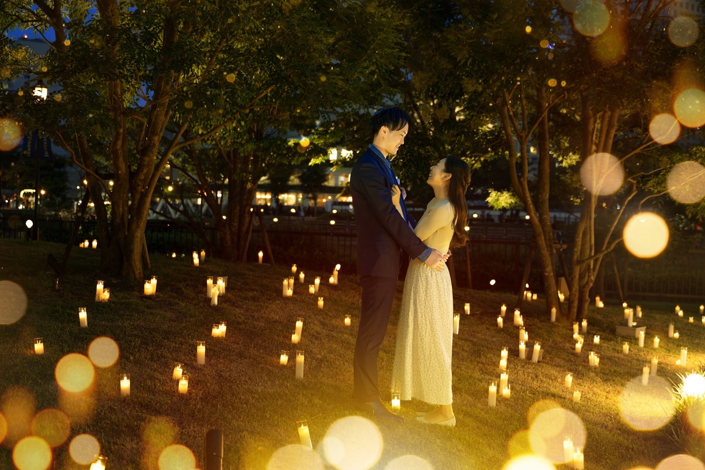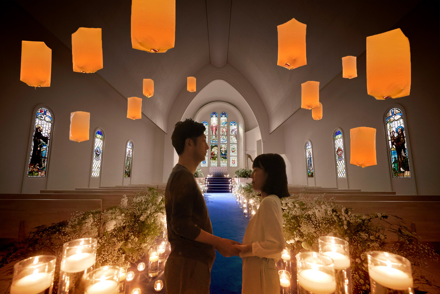 約500個のLEDキャンドルが灯る幻想的な空間で記念撮影を。