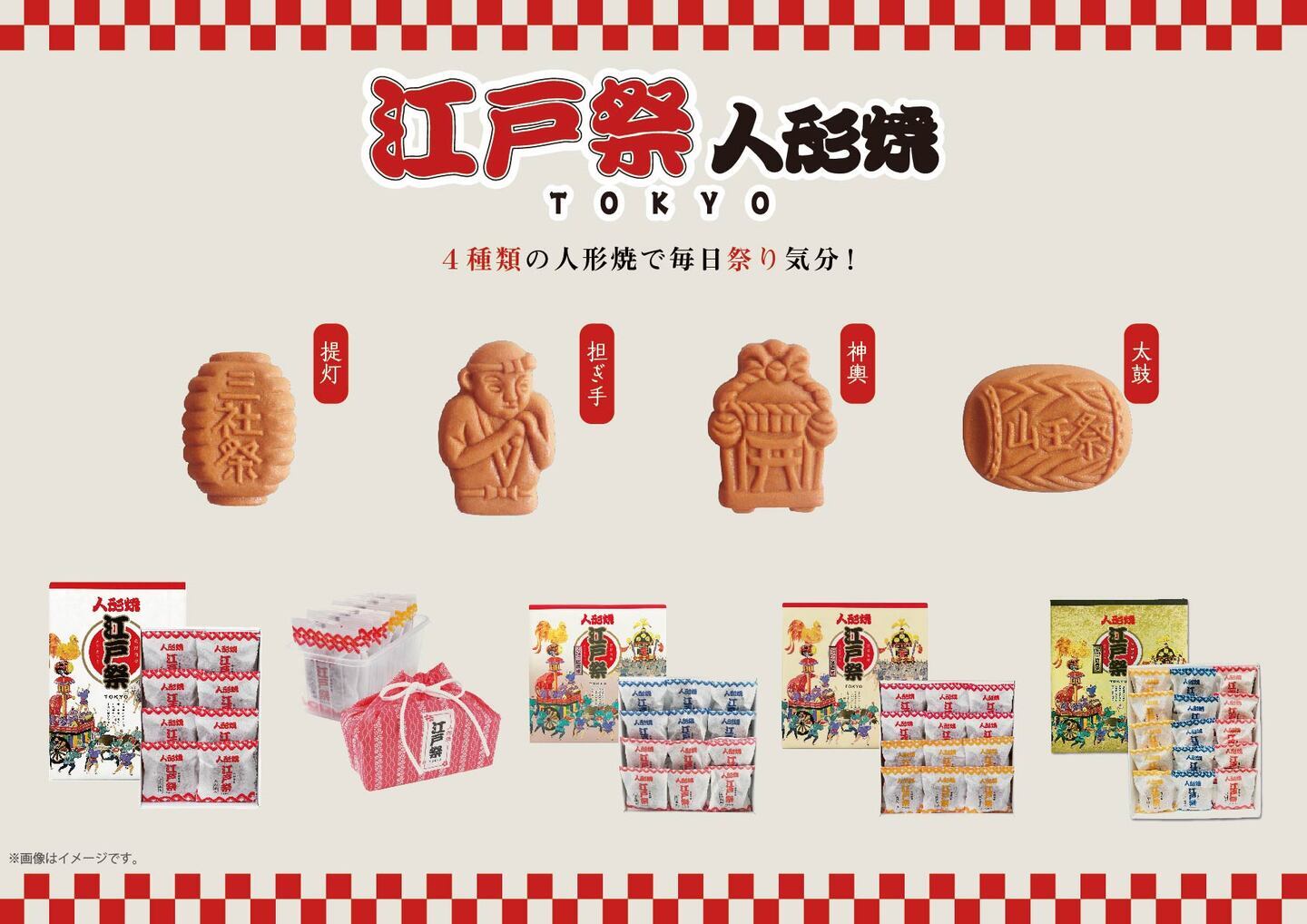 江戸祭人形焼は、江戸時代から続く東京下町の優しさと思いやり、躍動感あふれる活気などを、東京を代表する“祭”と“人形焼”を通し全国に伝えようと命名されました。水を一切使用せずに新鮮な鶏卵をたっぷりと使用した生地と、江戸祭人形焼専用のあん両方をお楽しみいただけるよう、生地の厚みとあんのバランスにこだわった、どこか懐かしいホッとする味わいです。型は江戸の祭をモチーフにした神輿・担ぎ手・提灯・太鼓の4種。見た目にも楽しい、威勢のよい祭囃子が聞こえてきそうな江戸の祭を模った人形焼です。