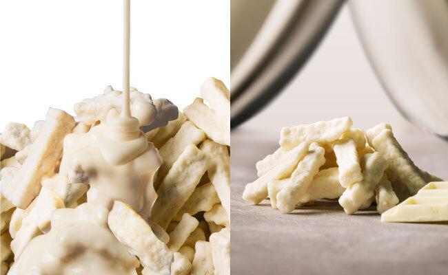 雪のように白く美しいホワイトチョコは、濃厚チョコとはひと味違う上品で繊細な甘さ。サクッと軽やかなサクまいもの食感に寄り添い、舌の上で雪解けのようにふわりと溶け出します。最後に広がるのは、サツマイモ本来の素朴な甘み。重なり合う味わいが、心までほどけるような至福のハーモニーを奏でます。