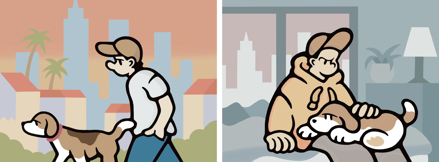 人々の生活の中からワンシーンを切り取り、感情豊かなキャラクターたちをポップな筆致で描く。