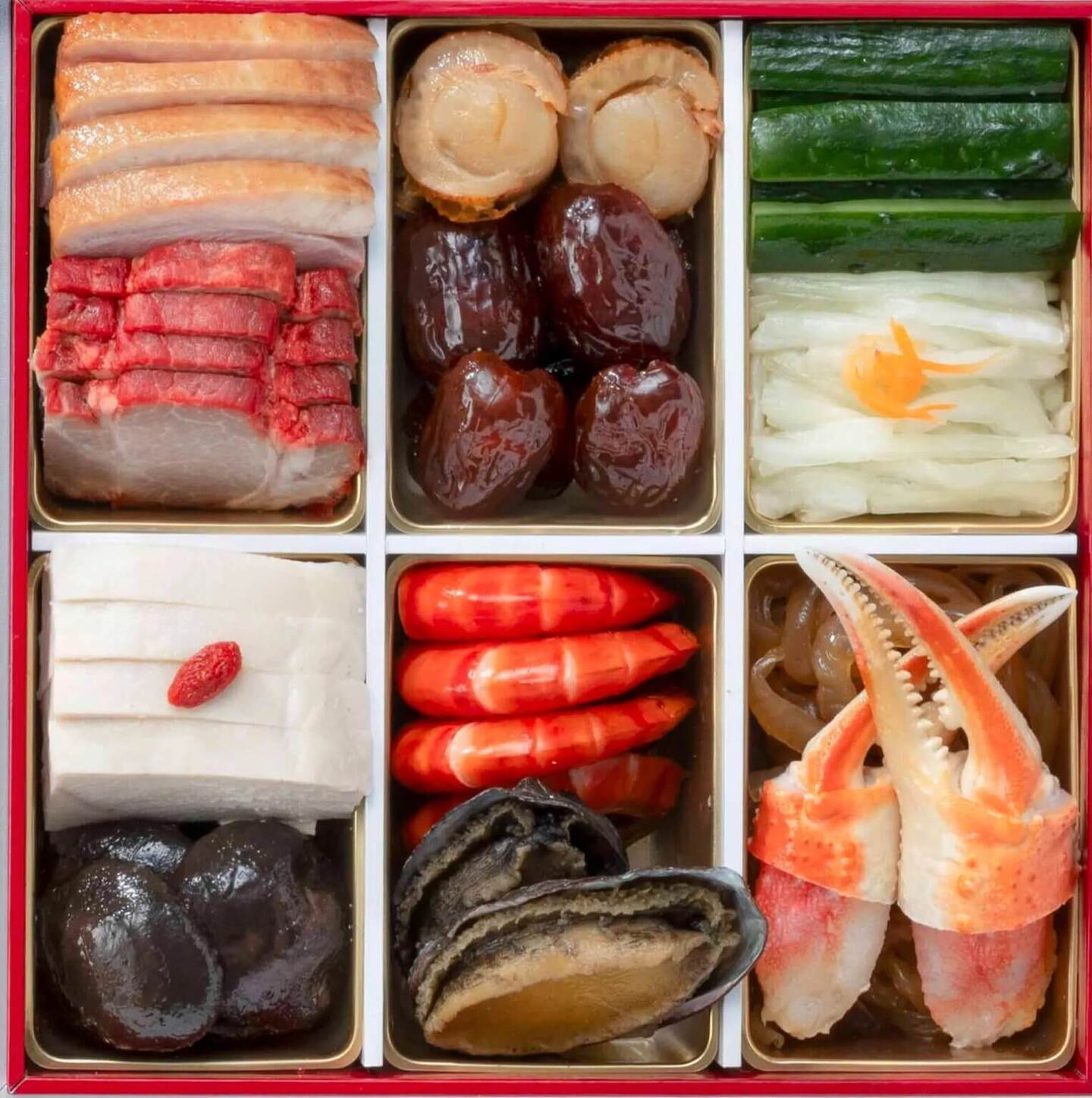 合鴨スモーク/焼豚/ホタテ照焼き/ナツメ甘露煮/きゅうり甘酢漬け/白菜甘酢漬け/オードブルチキン/椎茸醤油煮/ボイル海老/蒸し鮑/クラゲの冷製/カニ爪