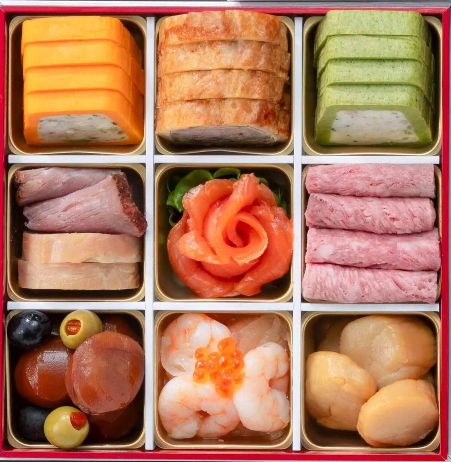 サーモンキャロットテリーヌ/パテ・ド・メゾン/海老とブロッコリーのテリーヌ/黒糖ローストポーク/スタッフドチキン/ディルサーモン/リーフレタス/サーロインローストビーフ/マロン赤ワイン煮/スタッフドオリーブ/ライプオリーブ/エビのエスカベッシュ/いくら/帆立貝柱燻製